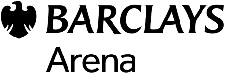 Barclays Arena mit großem Logo und Schriftzug, modernes Gebäude vor Stadtsilhouette bei blauem Himmel.