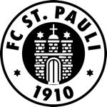 Hand hält lila Infoblatt vor dem Eingang des FC St. Pauli Stadions mit großem Vereinslogo.